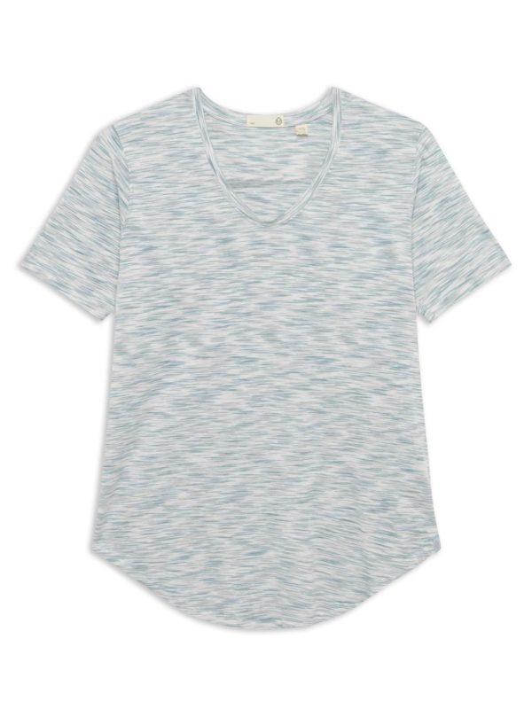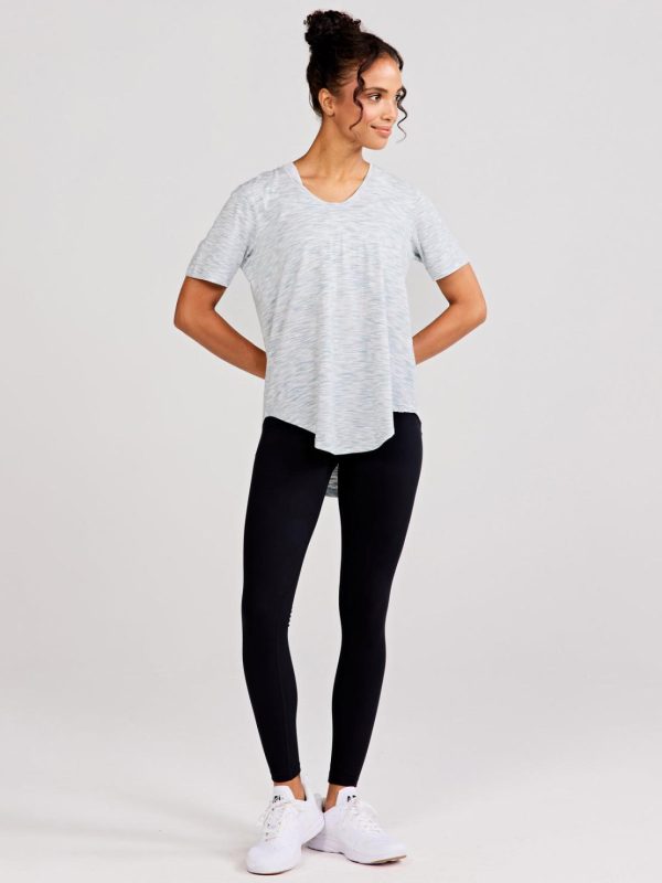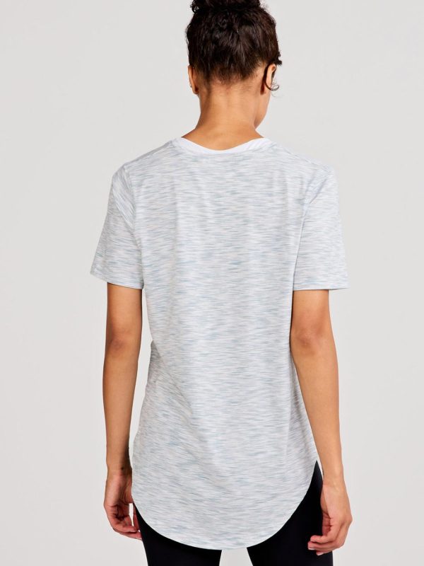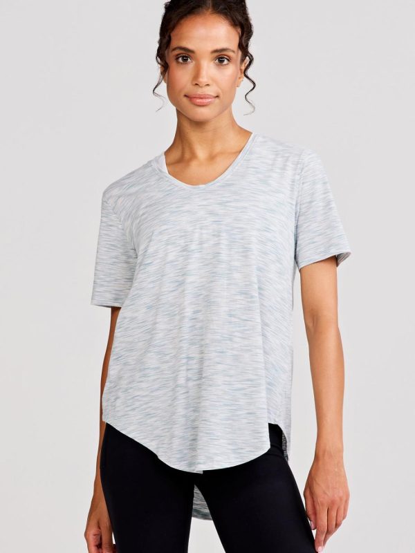 Relaxed fit, U-neck, Elbow length sleeves, Exaggerated curved shirttail hem, 29” length